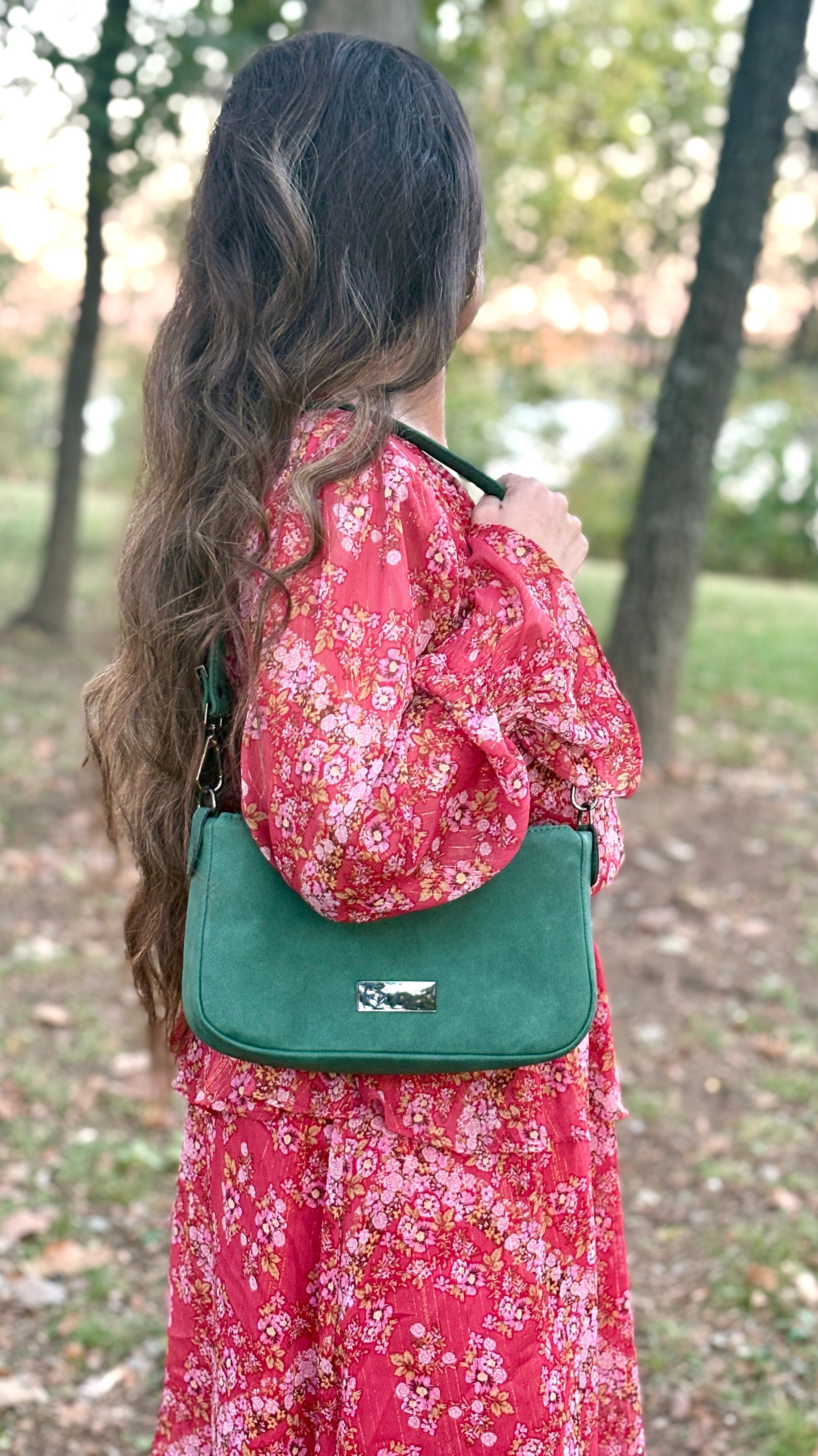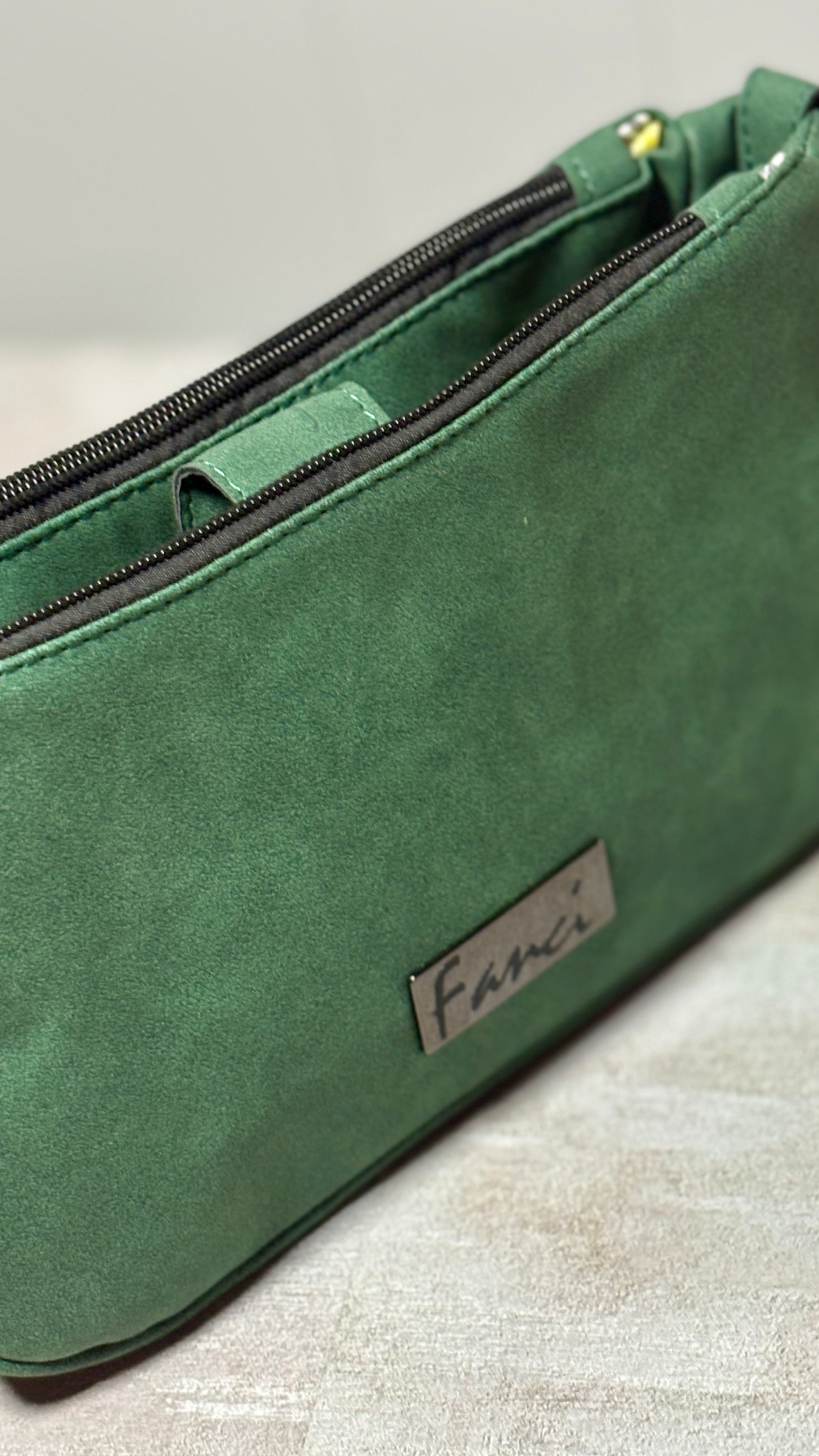 The exterior is made from soft green faux suede, featuring two curved top zipper pockets and a convenient center pocket with a magnetic snap closure.