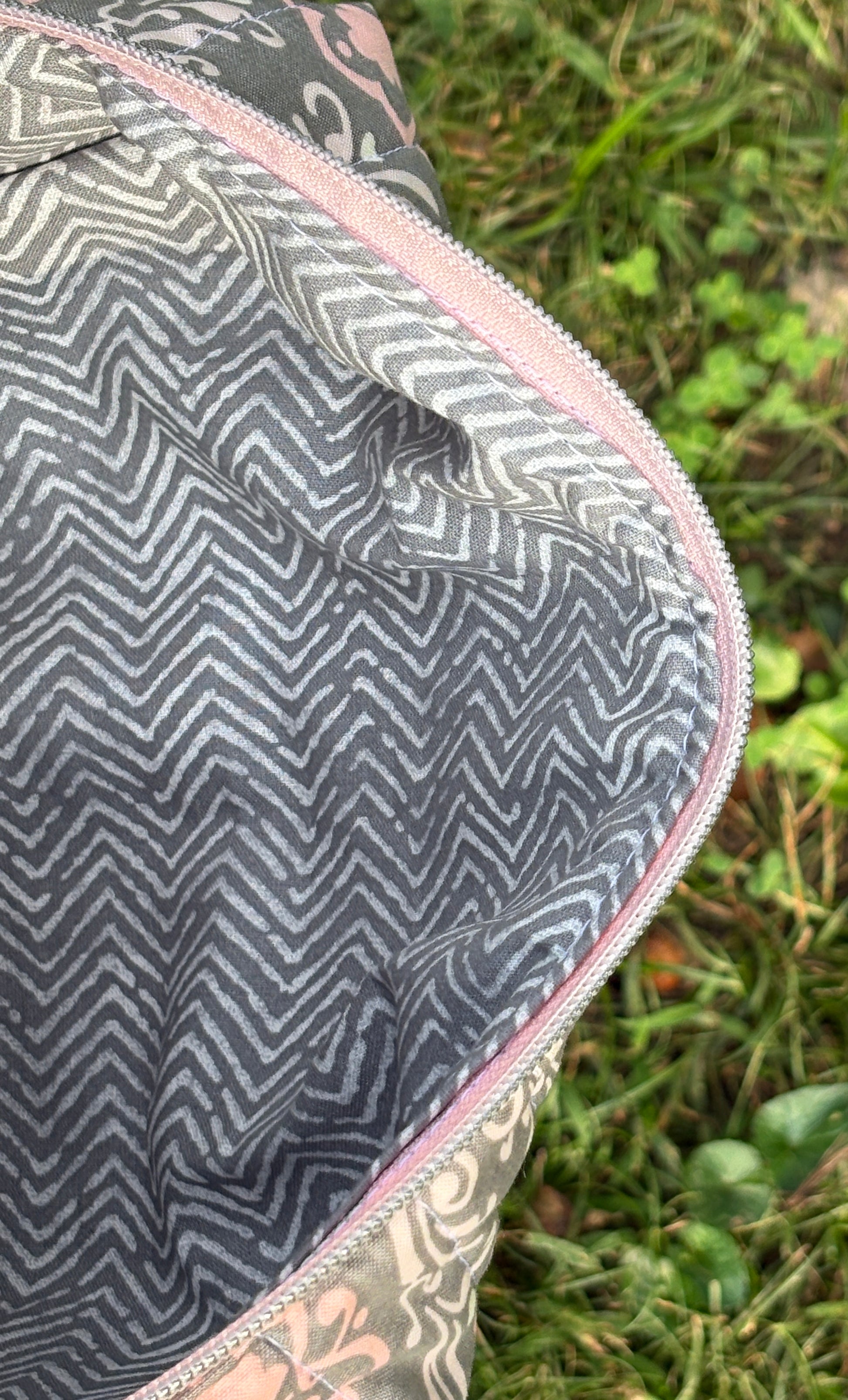 The Make-Up / Boxy Bag is both charming and practical, perfect for organizing your cosmetics or small essentials. Its exterior features a grey and pink design made with 100% quilting cotton. This bag includes 1 exterior tab and one handle for easy carrying.