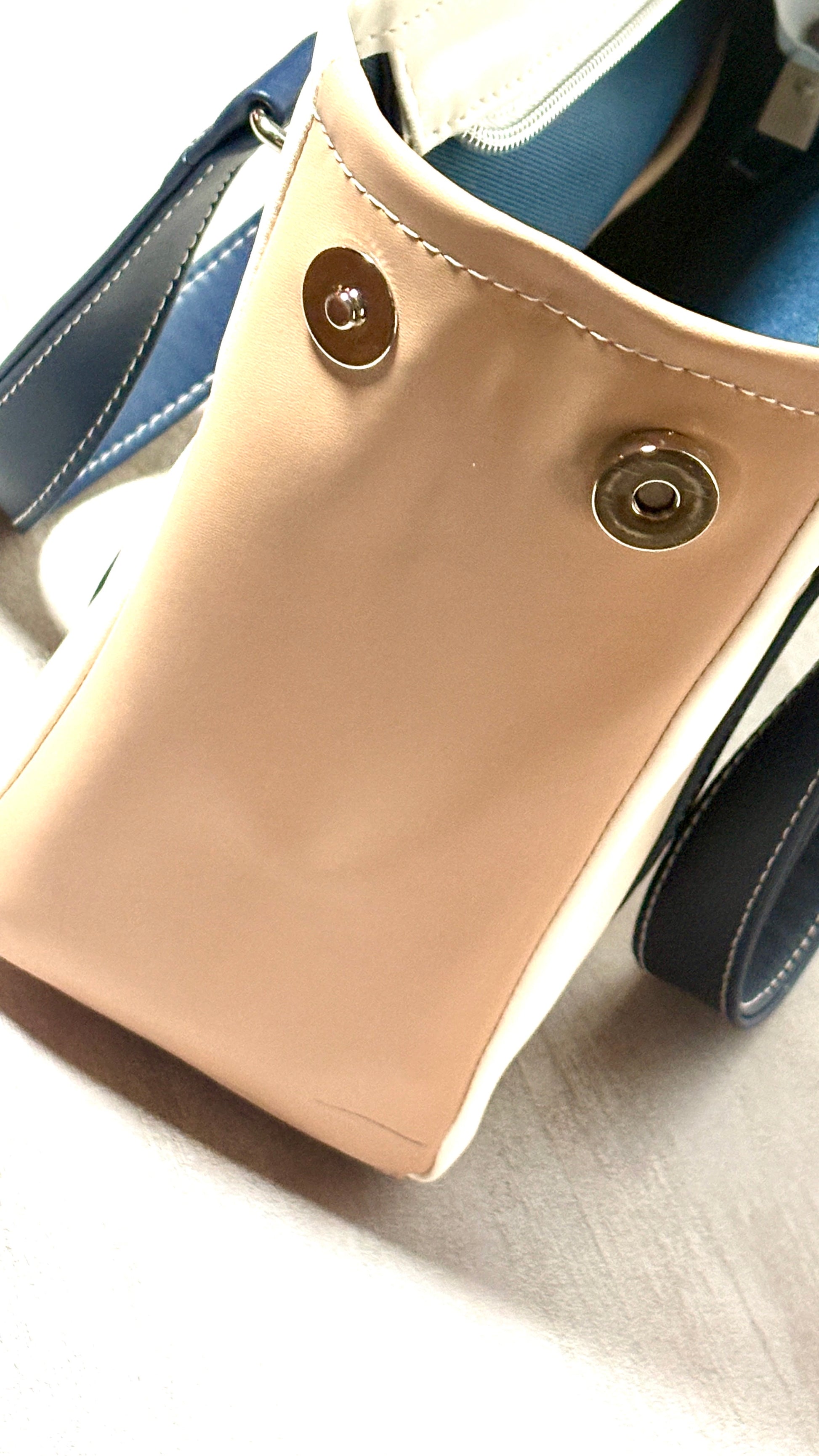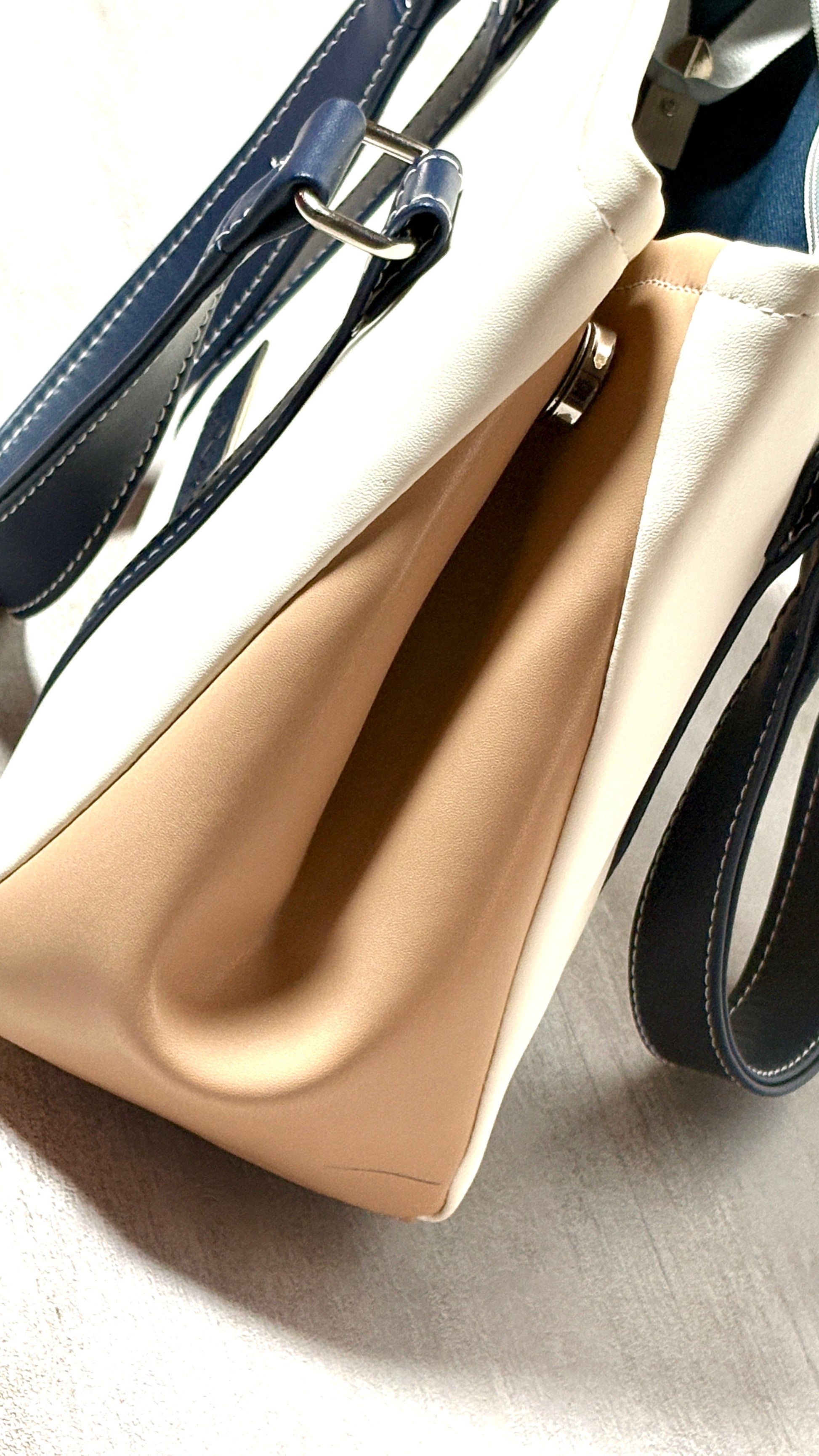 The Monroe Handbag is a stylish and versatile accessory designed for everyday use. Its white, navy, and beige smooth faux leather exterior creates a classic, timeless look, while two sturdy handles make it easy to carry. A recessed top zipper closure keeps your belongings secure, and side-panel magnetic snaps allow you to expand the bag when you need extra space. Purse feet protect the bottom and keep it looking pristine.